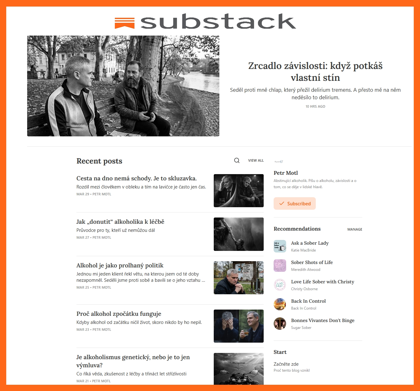 Vydávám články na platformě Substack. Můžete si zdrama přečíst moji tvorbu na téma alkoholové závislosti.